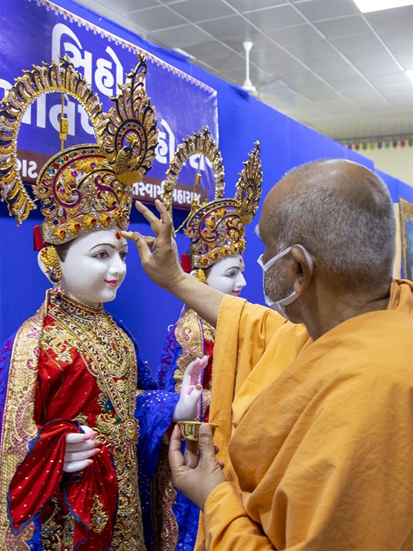 Param Pujya Mahant Swami Maharaj performs the morning arti