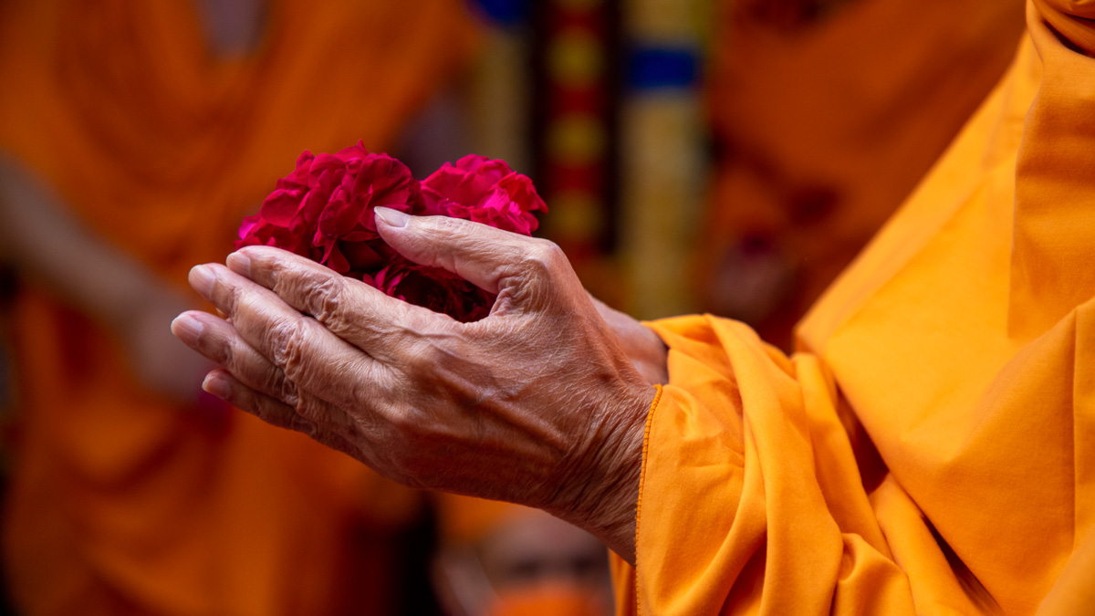Pujya Kothari Swami offers mantra-pushpanjali to Brahmaswarup Pramukh Swami Maharaj