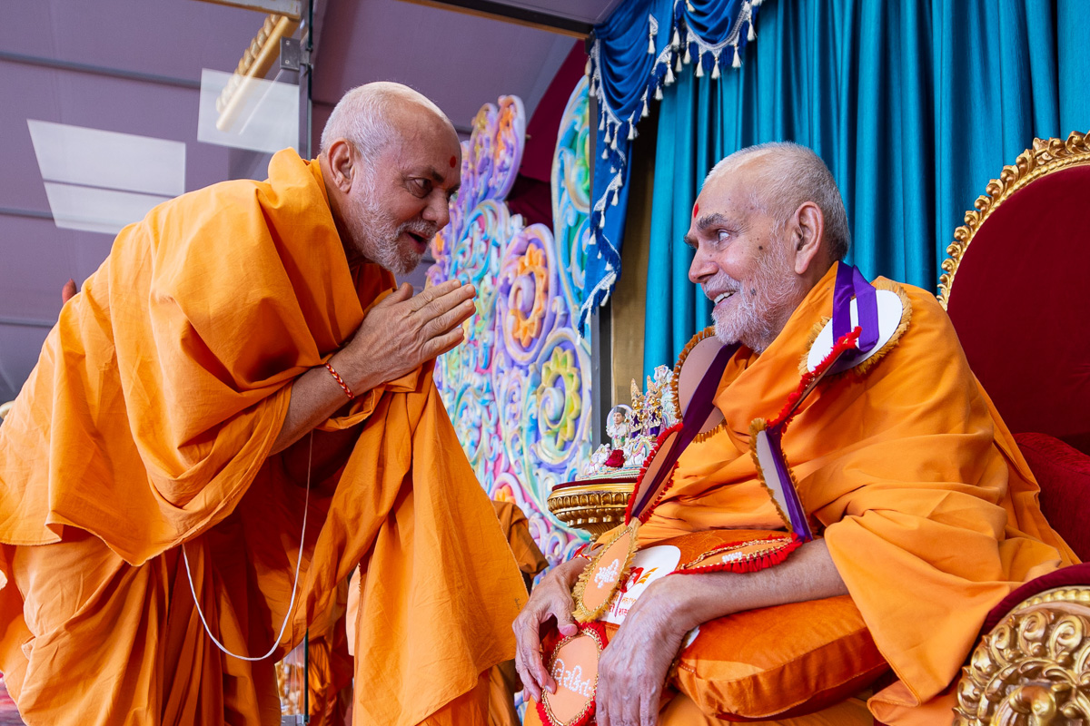 Pujya Viveksagar Swami honors Swamishri with a garland