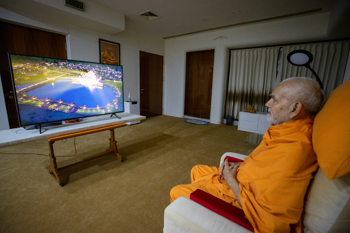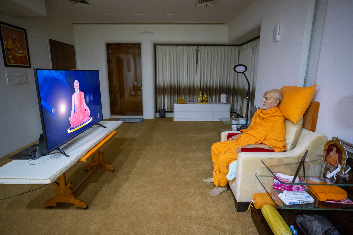 Swamishri watches webcast of the Brahmaswarup Pramukh Swami Maharaj's 100th Birthday Celebration assembly