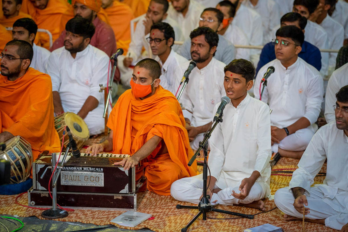 Param Pujya Mahant Swami Maharaj performs the morning arti