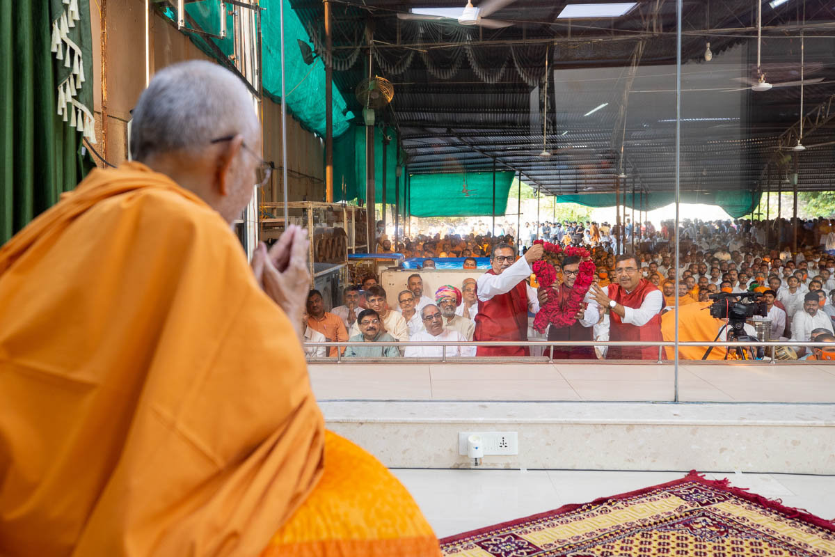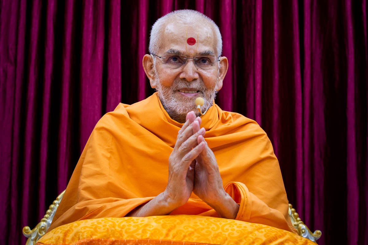 Swamishri greets Pujya Swayamprakash Swami (Doctor Swami) with folded hands