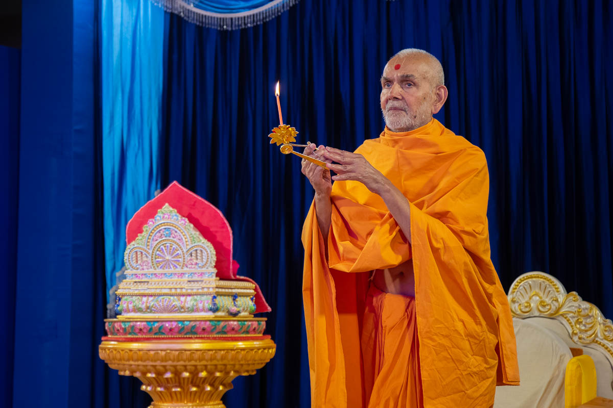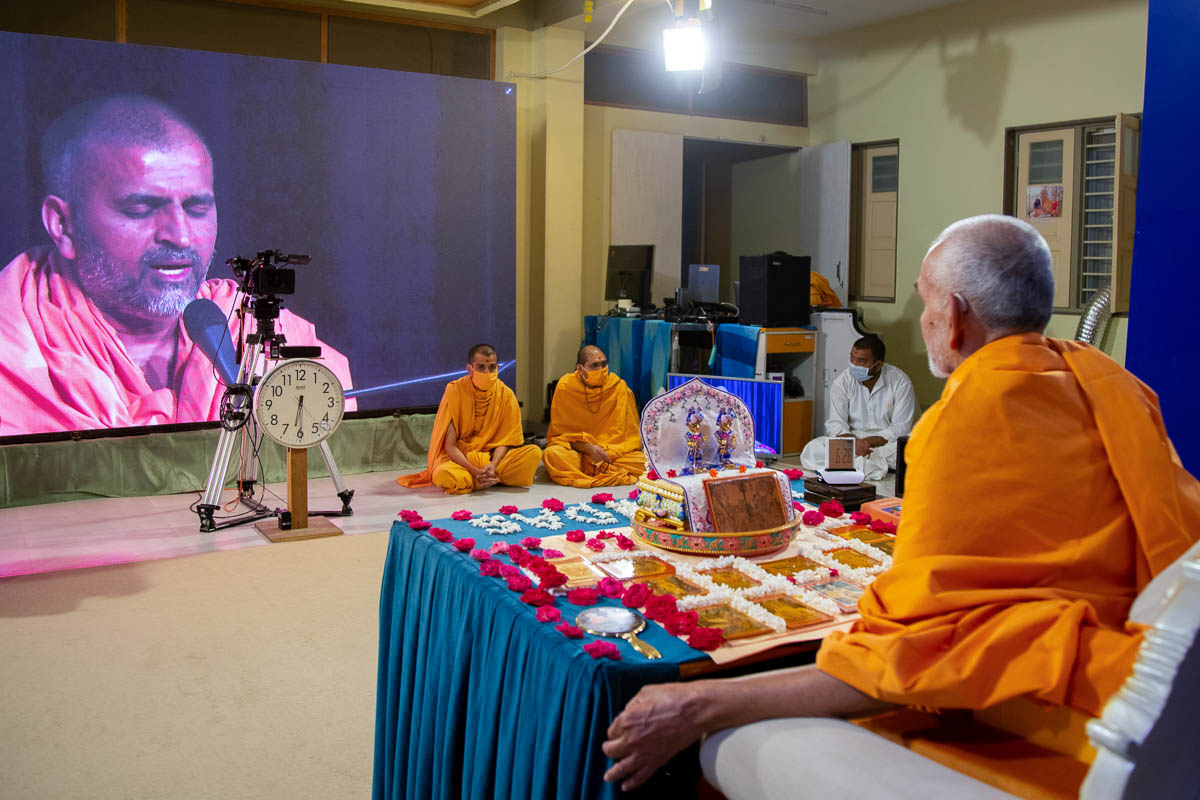 Swamishri chants the Swaminarayan dhun in memory of Mahamandaleshwar Pujya Shri Bharti Bapu
