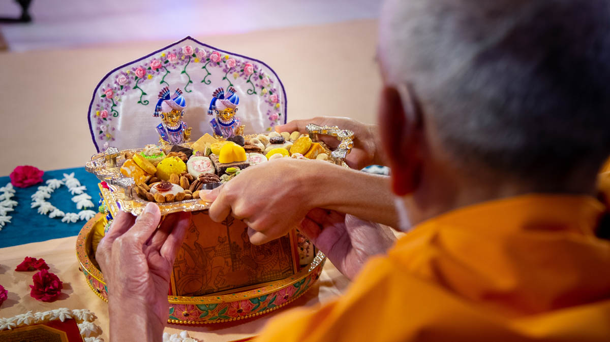 Swamishri offers thal to Shri Harikrishna Maharaj and Shri Gunatitanand Swami