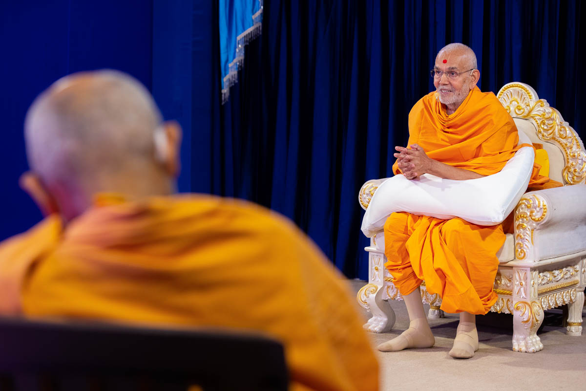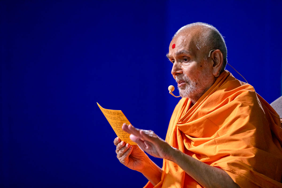 Swamishri during the prayer assembly in memory of the late Mahamandaleshwar Pujya Shri Bharti Bapu
