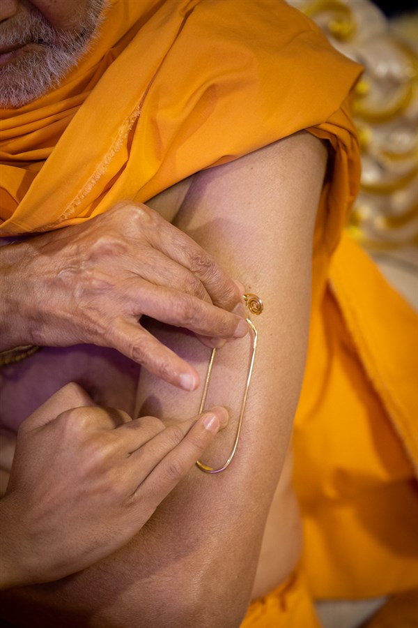 Swamishri observes chandan garments offered to Shri Harikrishna Maharaj and Shri Gunatitanand Swami