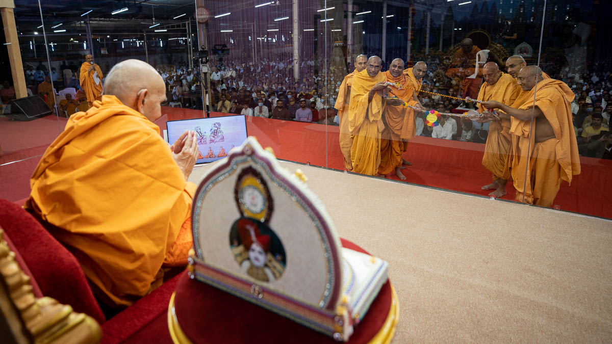 Pujya Tyagvallabh Swami honors Swamishri with a garland