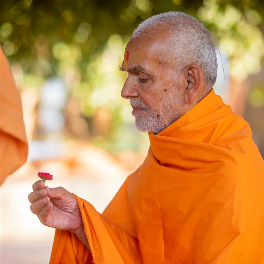 Swamishri trims a flower before offering it to Shri Harikrishna Maharaj