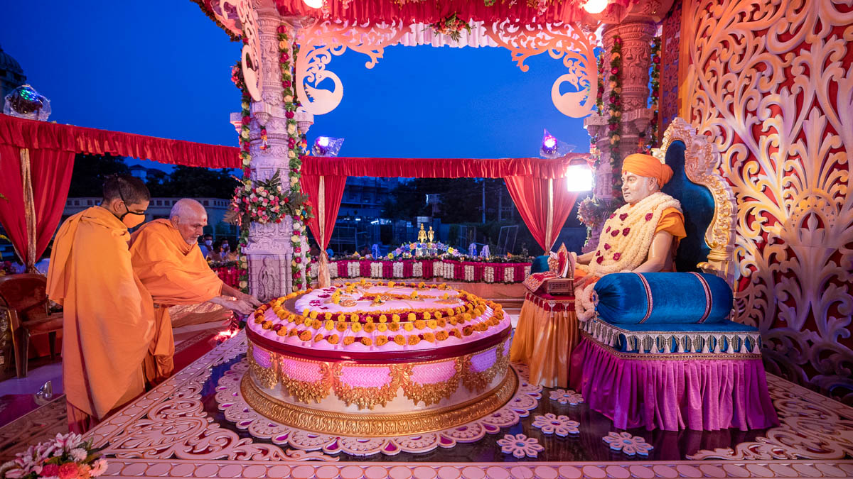 Swamishri swings Shri Harikrishna Maharaj and Shri Gunatitanand Swami on a hindolo