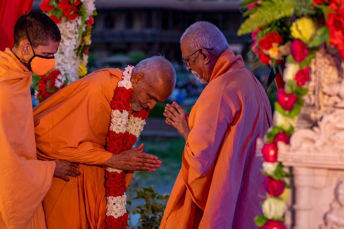 Swamishri greets Pujya Doctor Swami with 'Jai Swaminarayan'