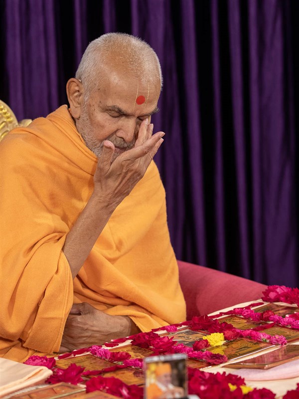 Param Pujya Mahant Swami Maharaj engrossed in darshan of Shri Harikrishna Maharaj and Shri Gunatitanand Swami