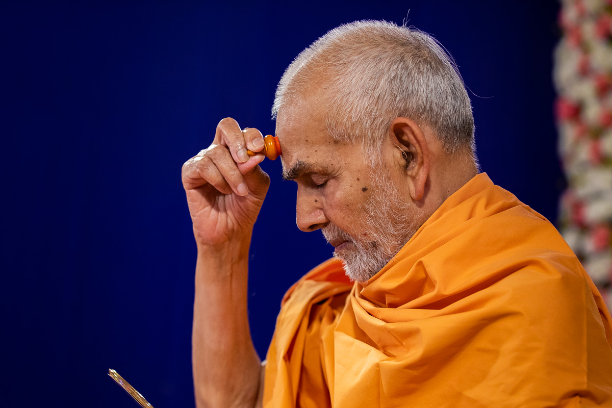 Param Pujya Mahant Swami Maharaj performs the morning arti
