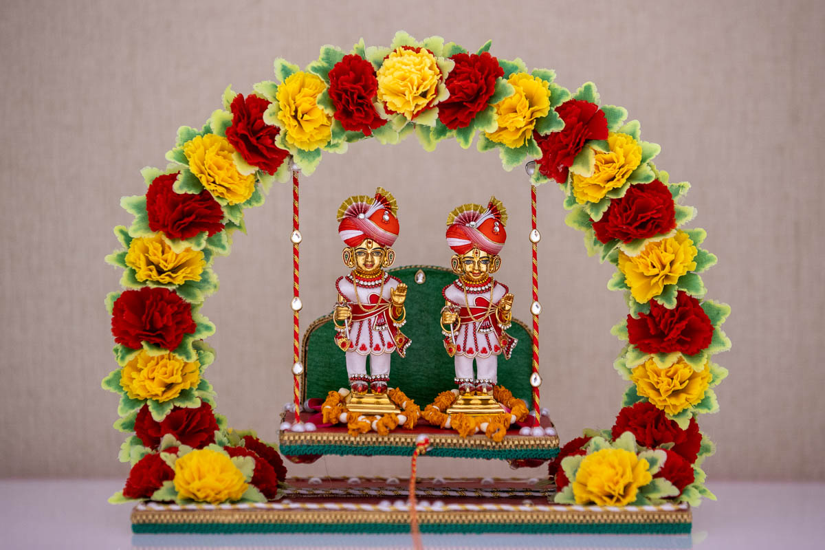 Swamishri swings Shri Harikrishna Maharaj and Shri Gunatitanand Swami on a hindolo