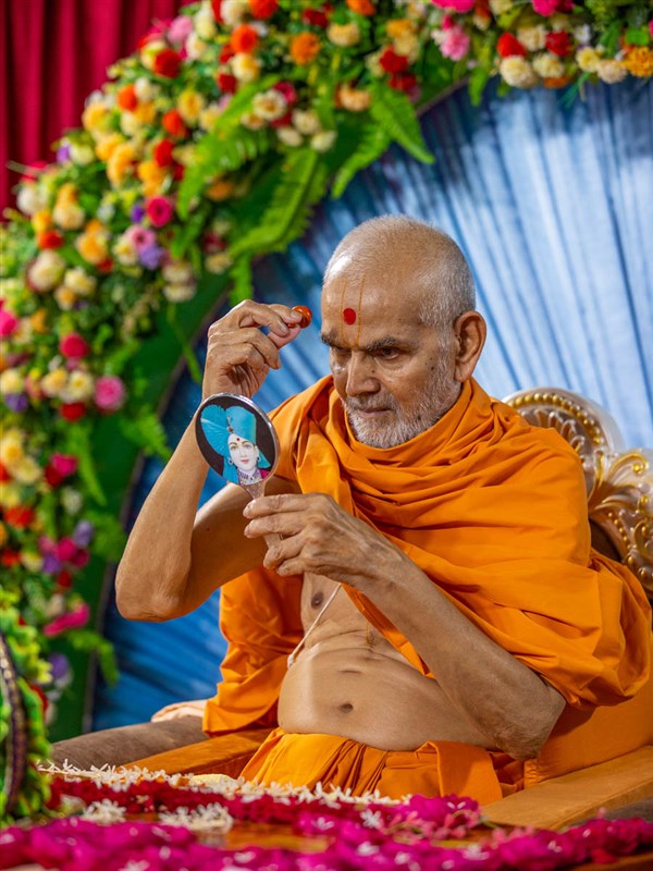 Param Pujya Mahant Swami Maharaj honors Brahmaswarup Pramukh Swami Maharaj with a garland in his daily puja