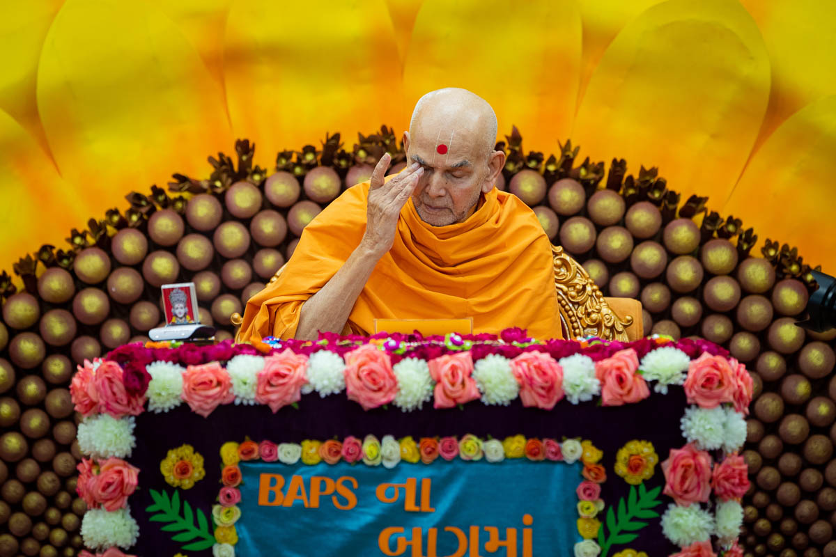 Param Pujya Mahant Swami Maharaj performs the morning arti