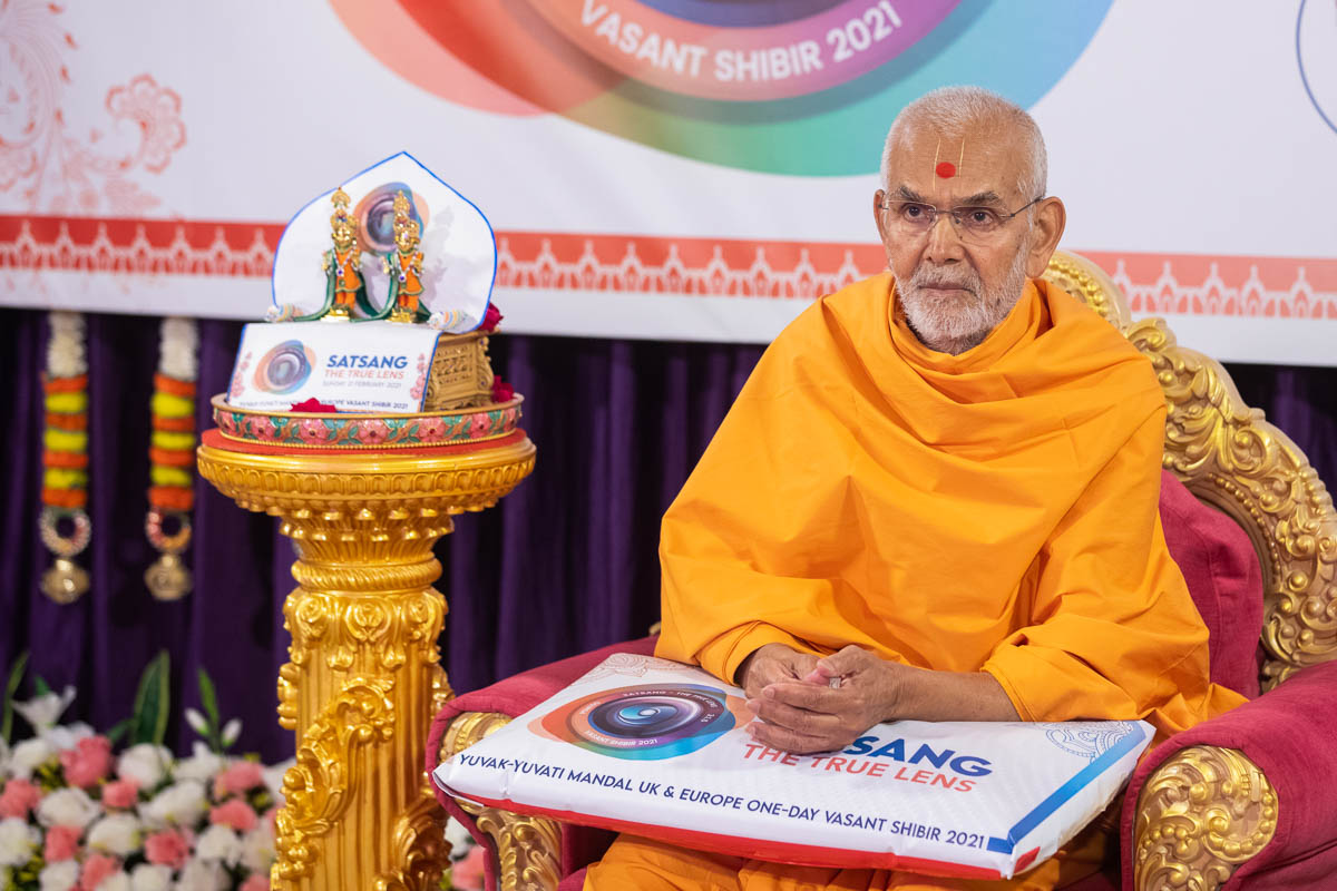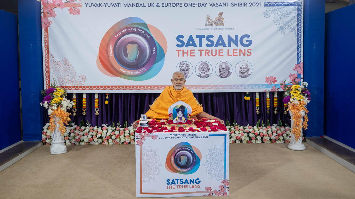 Swamishri lights the inaugural lamp for the online 'Vasant Shibir: Satsang - The True Lens' for yuvaks and yuvatis in the UK & Europe