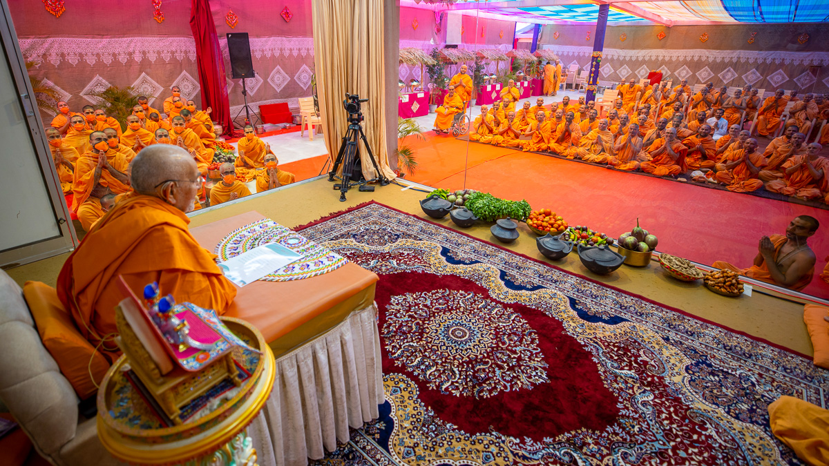 Swamishri and sadhus chant the Swaminarayan dhun in the Akshar Deri