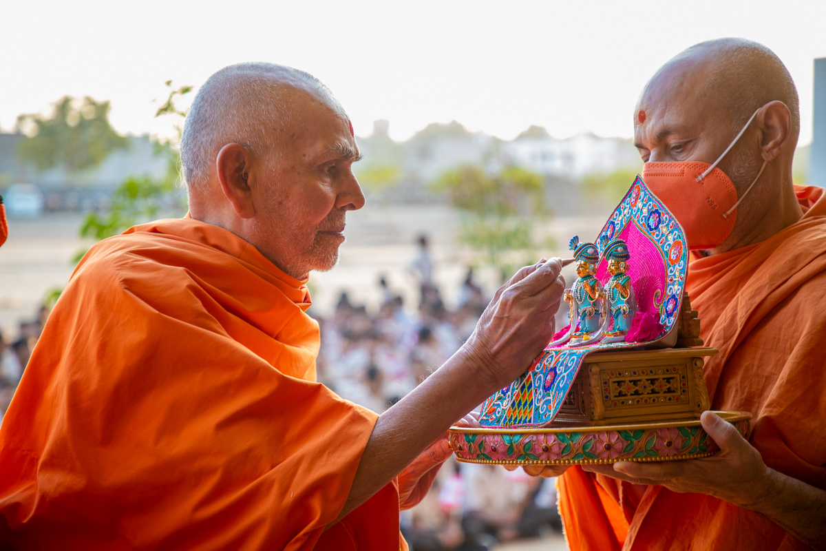 Param Pujya Mahant Swami Maharaj applies a tilak on his forehead
