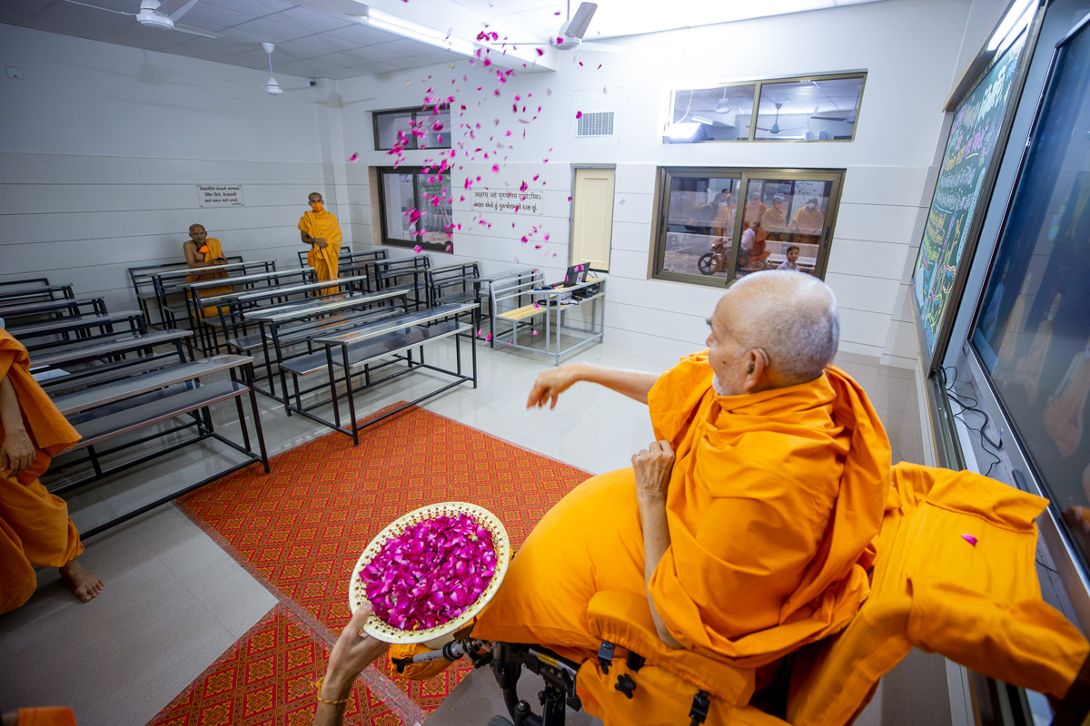 Swamishri arrives to inaugurate a new building of the BAPS Swaminarayan Vidyamandir, Gondal