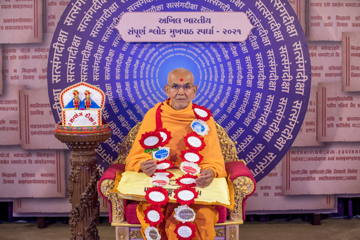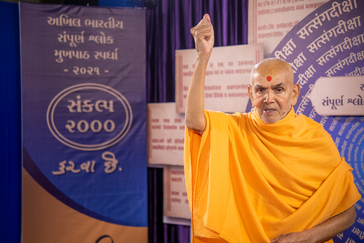 Swamishri lights the lamp to inaugurate the 'Akhil Bharatiya Sampurna Shlok Mukhpath Spardha - 2021'