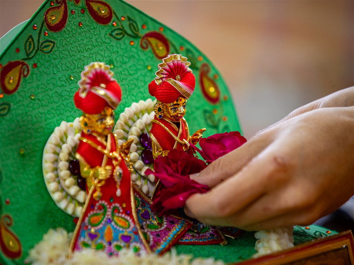 Flowers are offered to Shri Harikrishna Maharaj and Shri Gunatitanand Swami