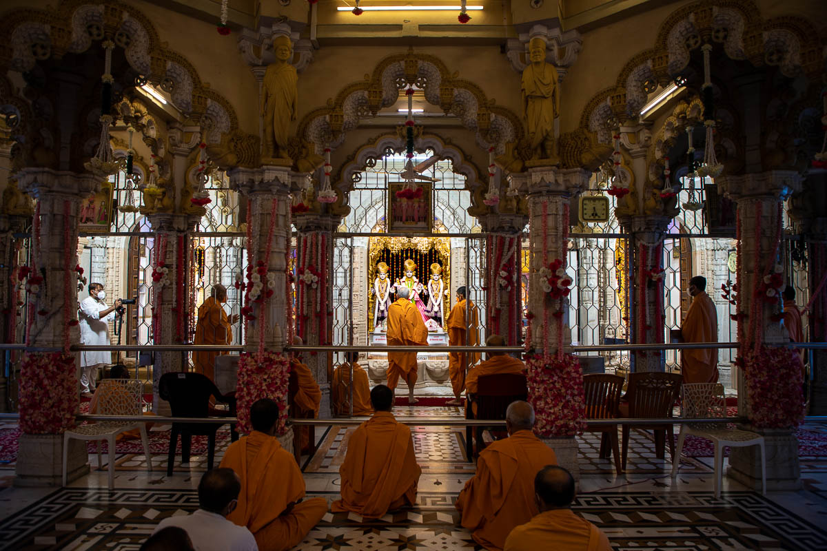 Swamishri, Pujya Ishwarcharan Swami and Pujya Viveksagar Swami perform the evening arti