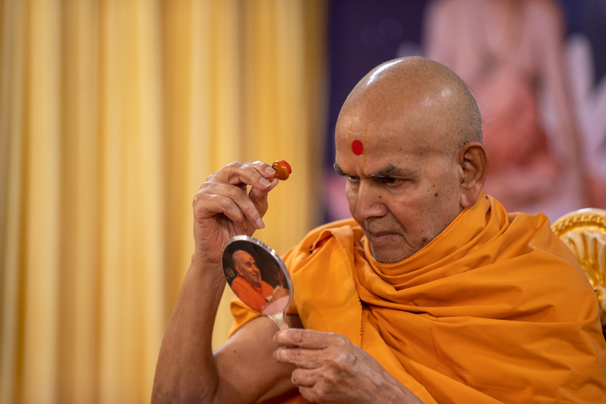 Param Pujya Mahant Swami Maharaj performs the morning arti
