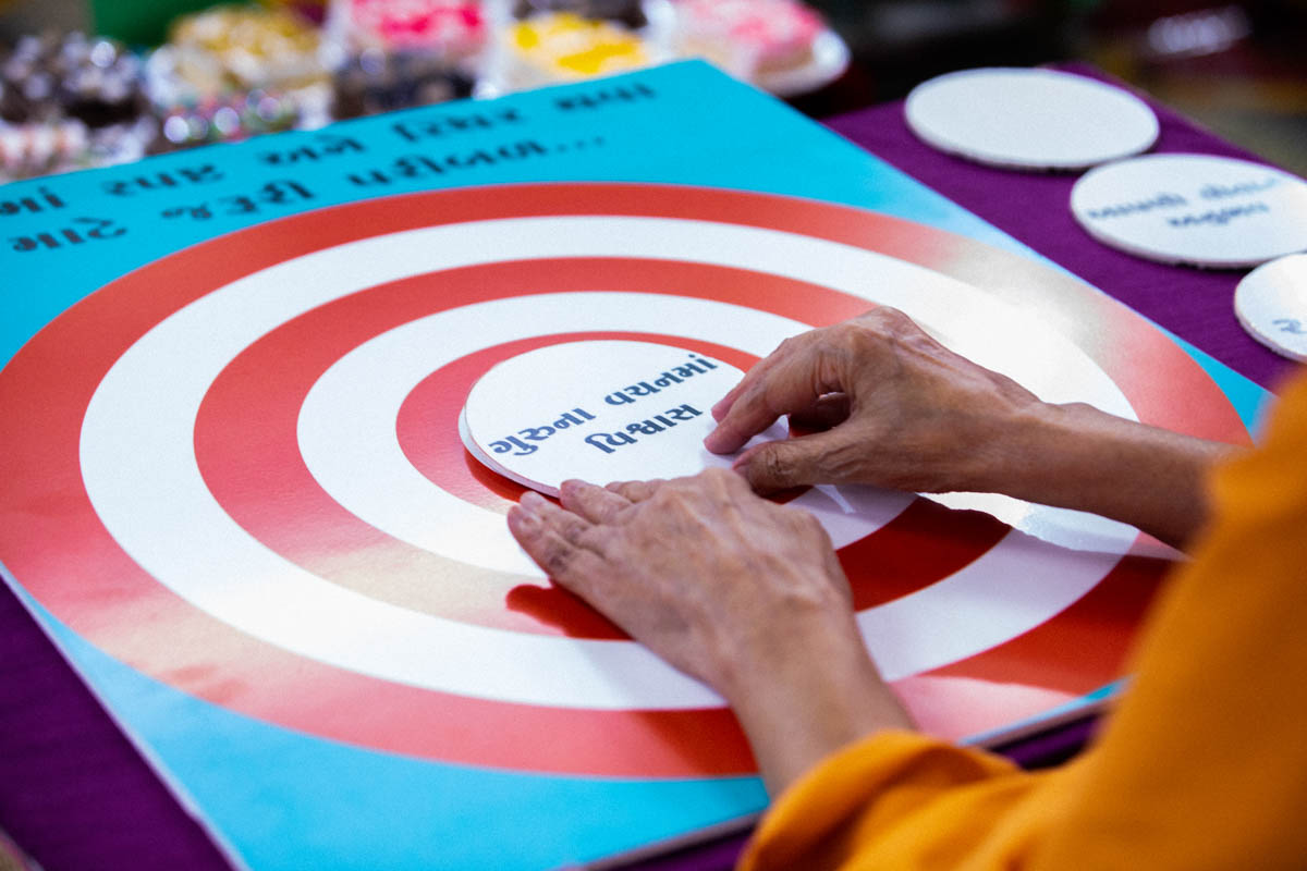 A child leads everyone in reciting the sadhana mantra and daily prayer in Swamishri's puja