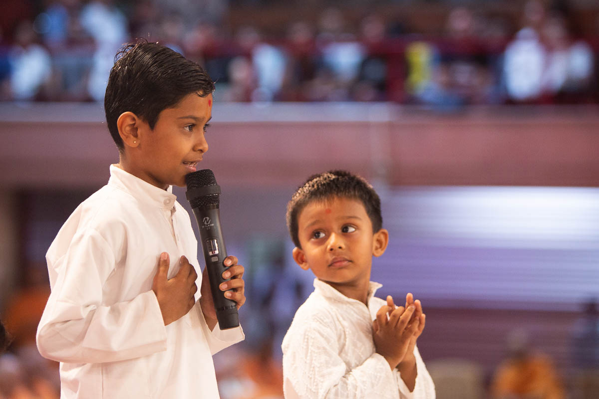 Children recite scriptural passages in Swamishri's puja