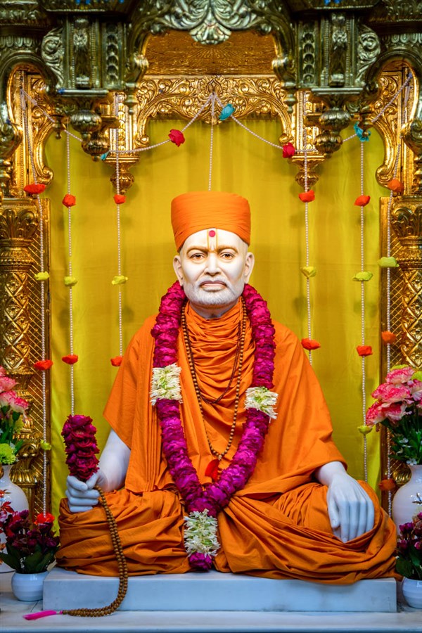 Swamishri engrossed in darshan of Shri Akshar-Purushottam Maharaj