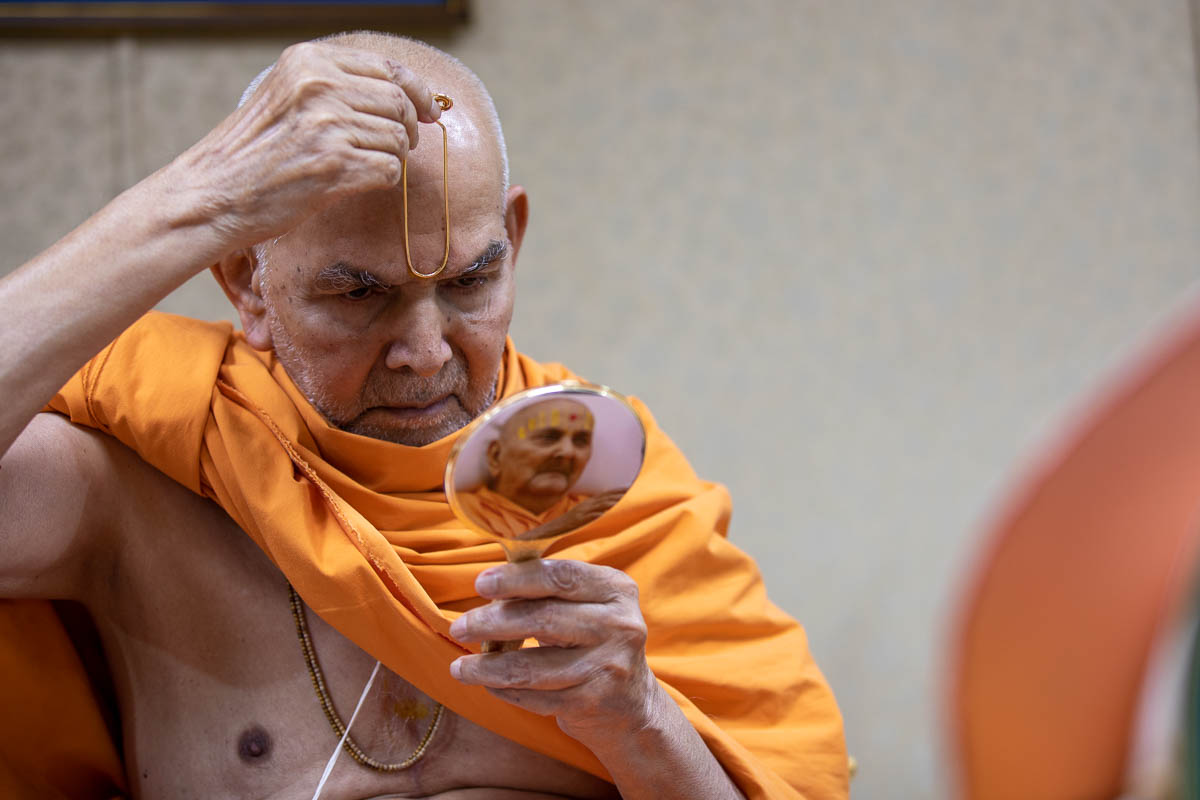 Swamishri applies a tilak on his forehead