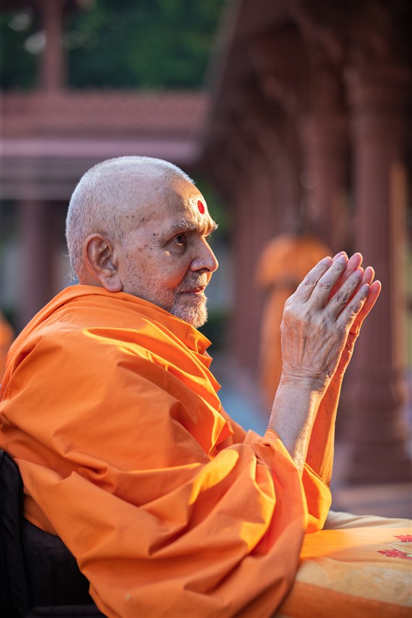 Swamishri engrossed in darshan of Shri Akshar-Purushottam Maharaj
