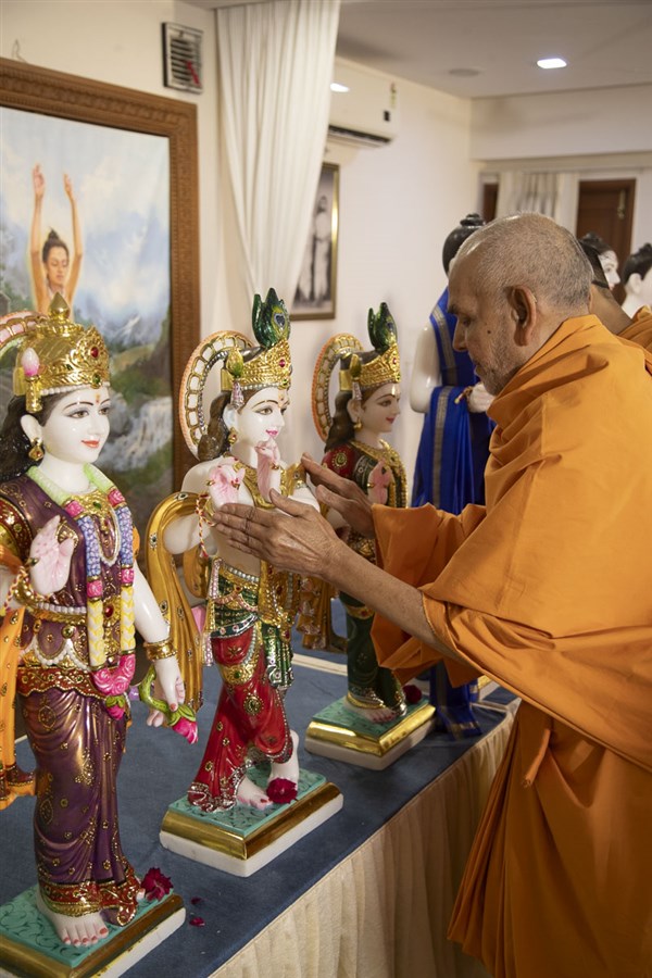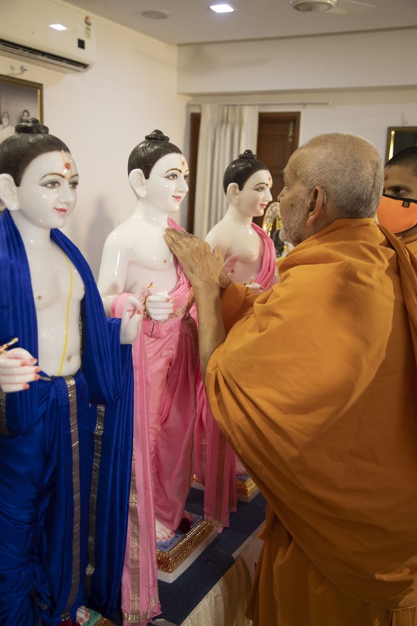 Swamishri engrossed in darshan of Shri Harikrishna Maharaj and Shri Radha-Krishna Dev