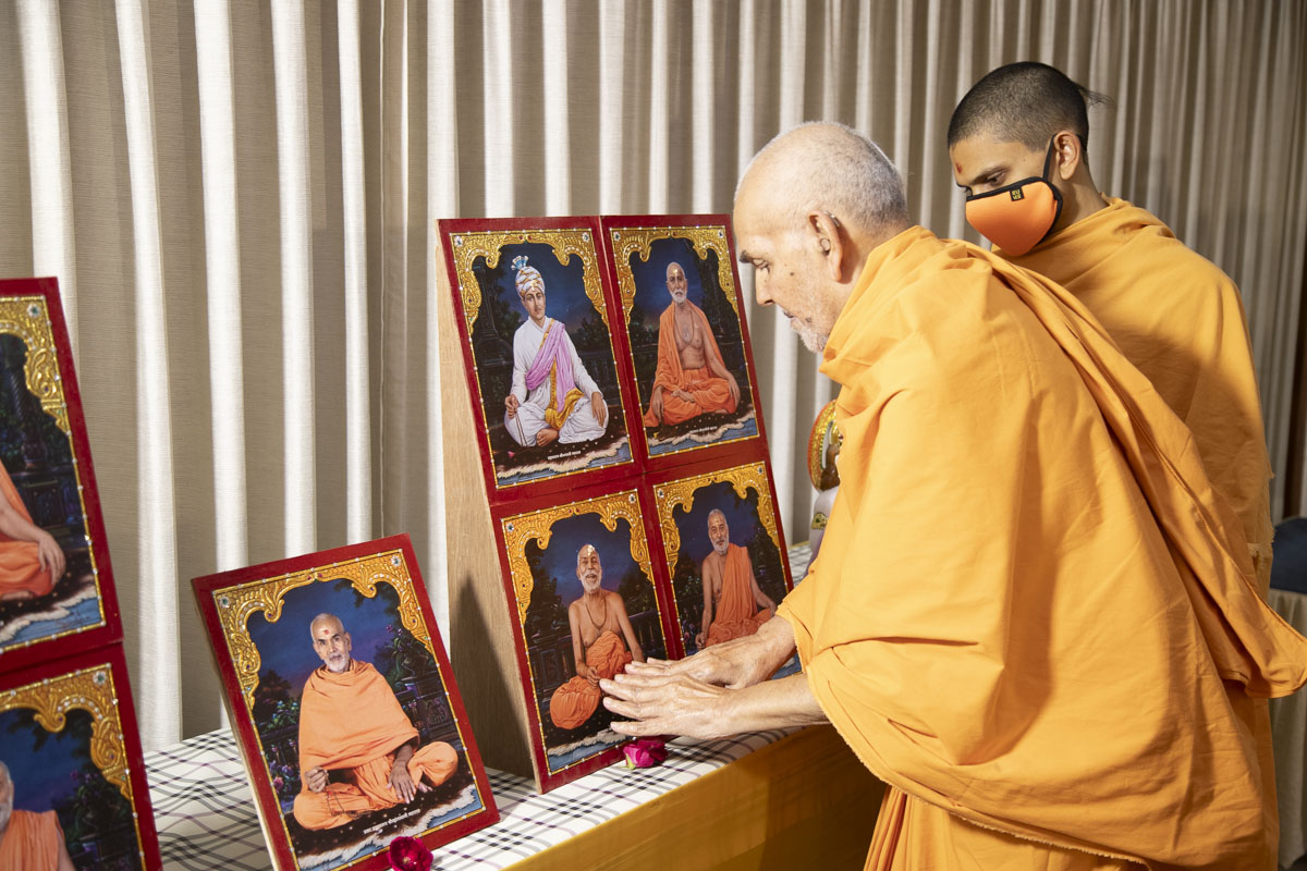 Swamishri offers a flower to Shri Harikrishna Maharaj and Shri Gunatitanand Swami