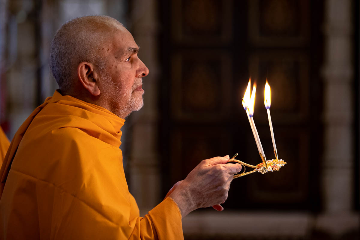 Swamishri offers thal to Shri Akshar-Purushottam Maharaj