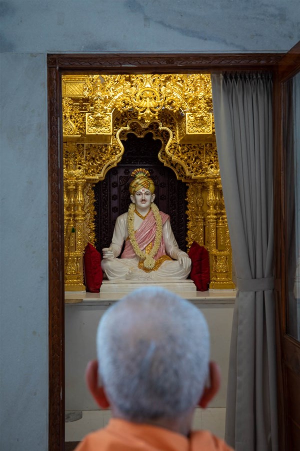 Swamishri engrossed in darshan of Shri Akshar-Purushottam Maharaj