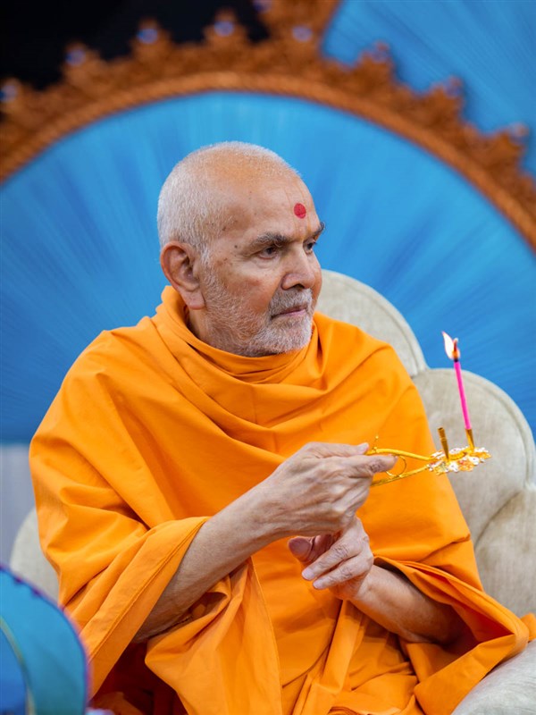 Param Pujya Mahant Swami Maharaj performs the morning arti