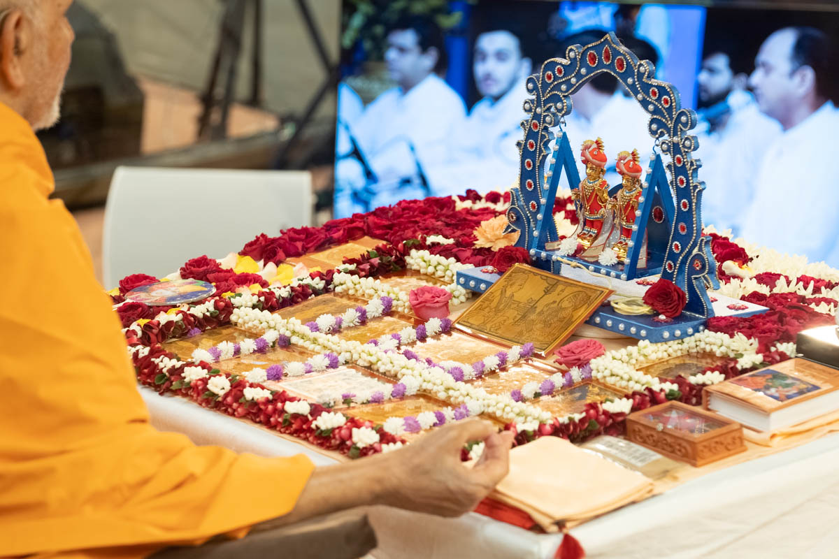 Swamishri engrossed in darshan of Shri Harikrishna Maharaj and Shri Radha-Krishna Dev