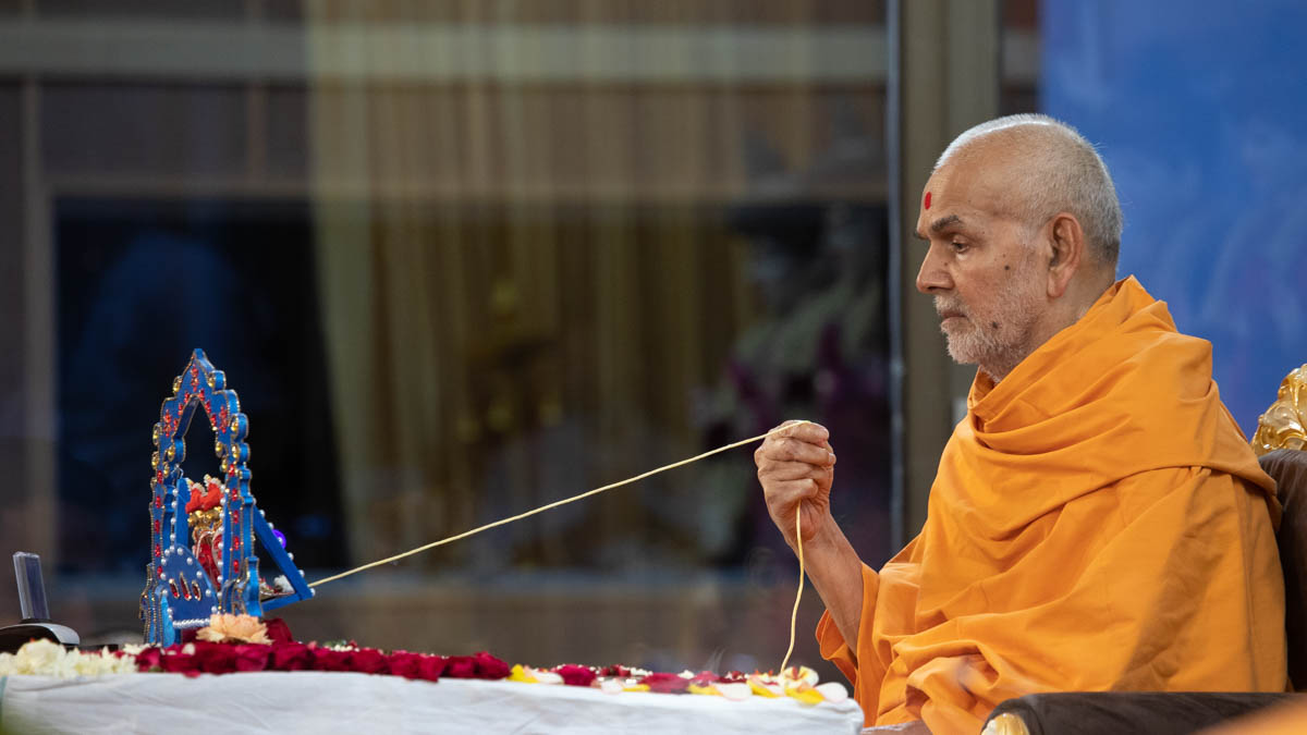 Swamishri swings Bhagwan Swaminarayan and Aksharbrahma Gunatitanand Swami on a hindolo