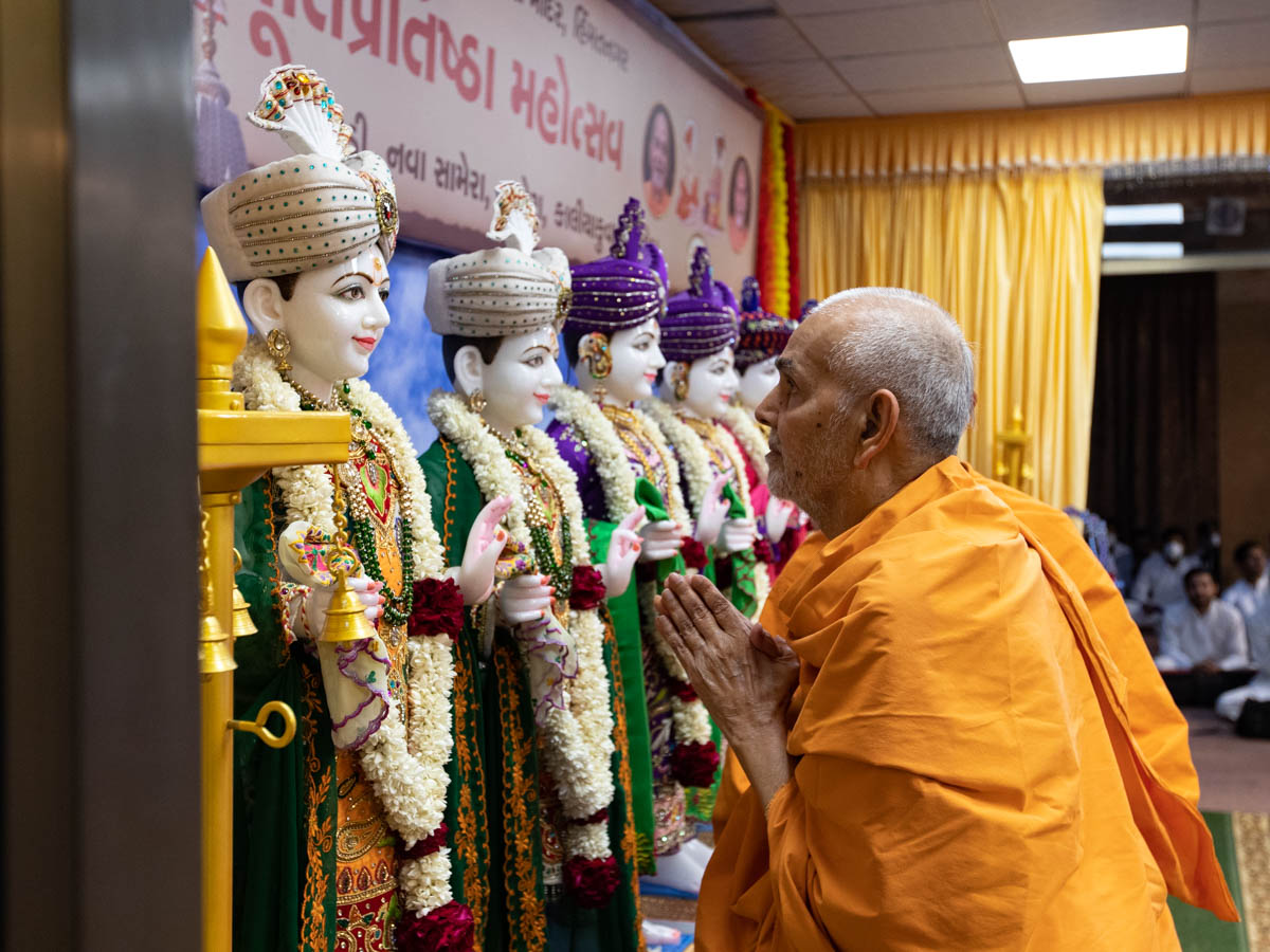 Swamishri engrossed in darshan of Bhagwan Swaminarayan, Aksharbrahma Gunatitanand Swami and Shri Gopalanand Swami