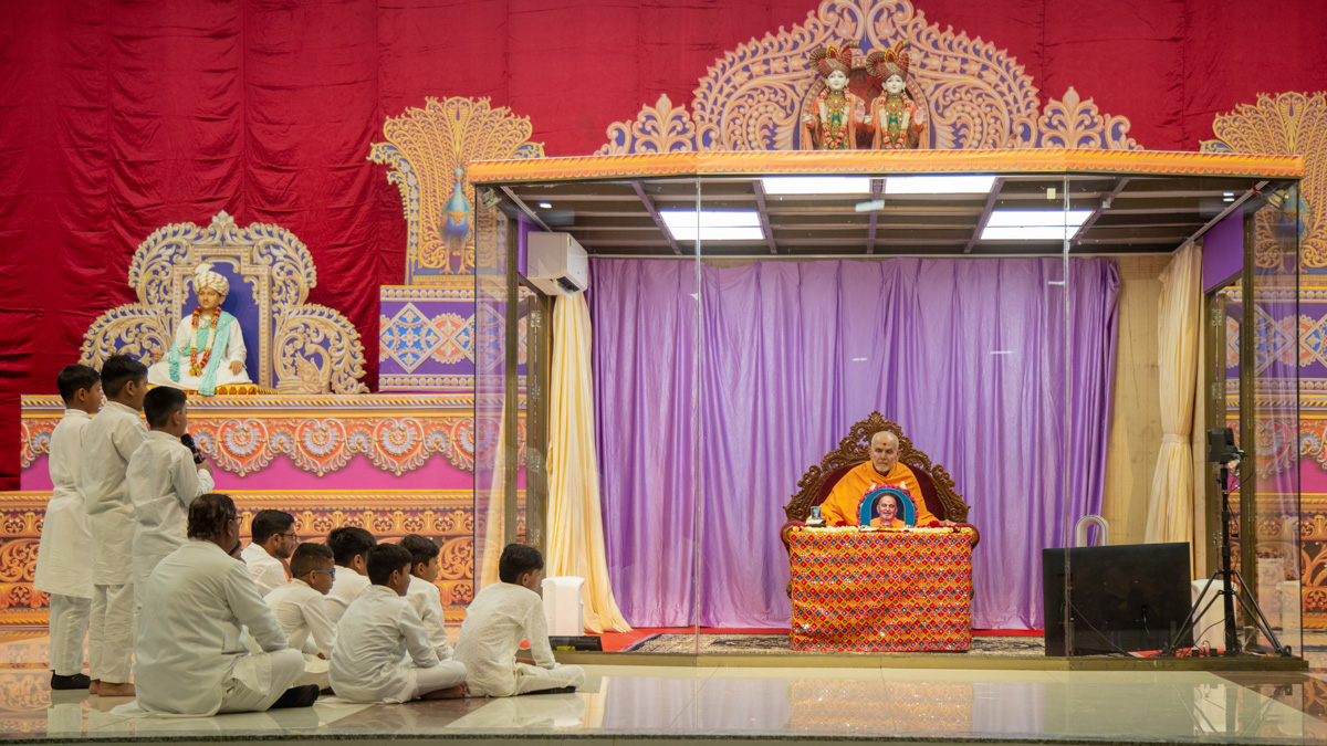 Children lead everyone in reciting the sadhana mantra and daily prayer in Swamishri's puja