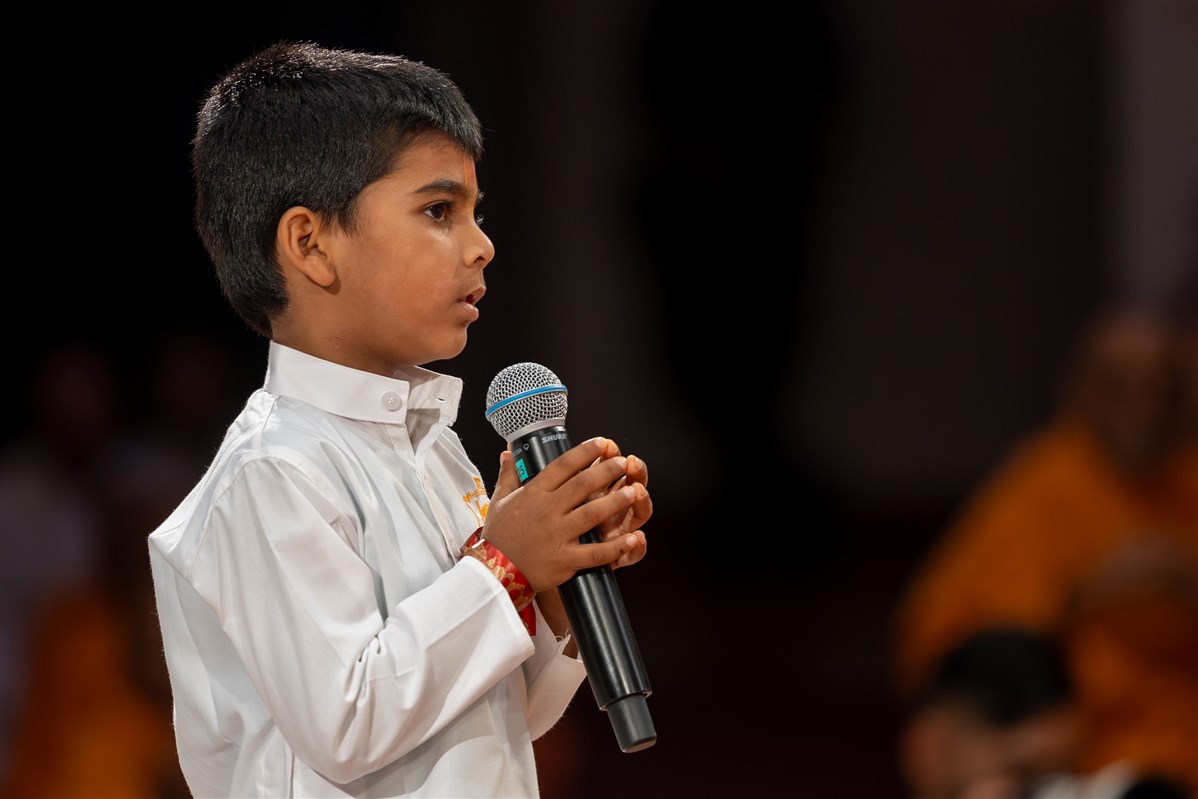 A child leads everyone in reciting the sadhana mantra and daily prayer in Swamishri's puja
