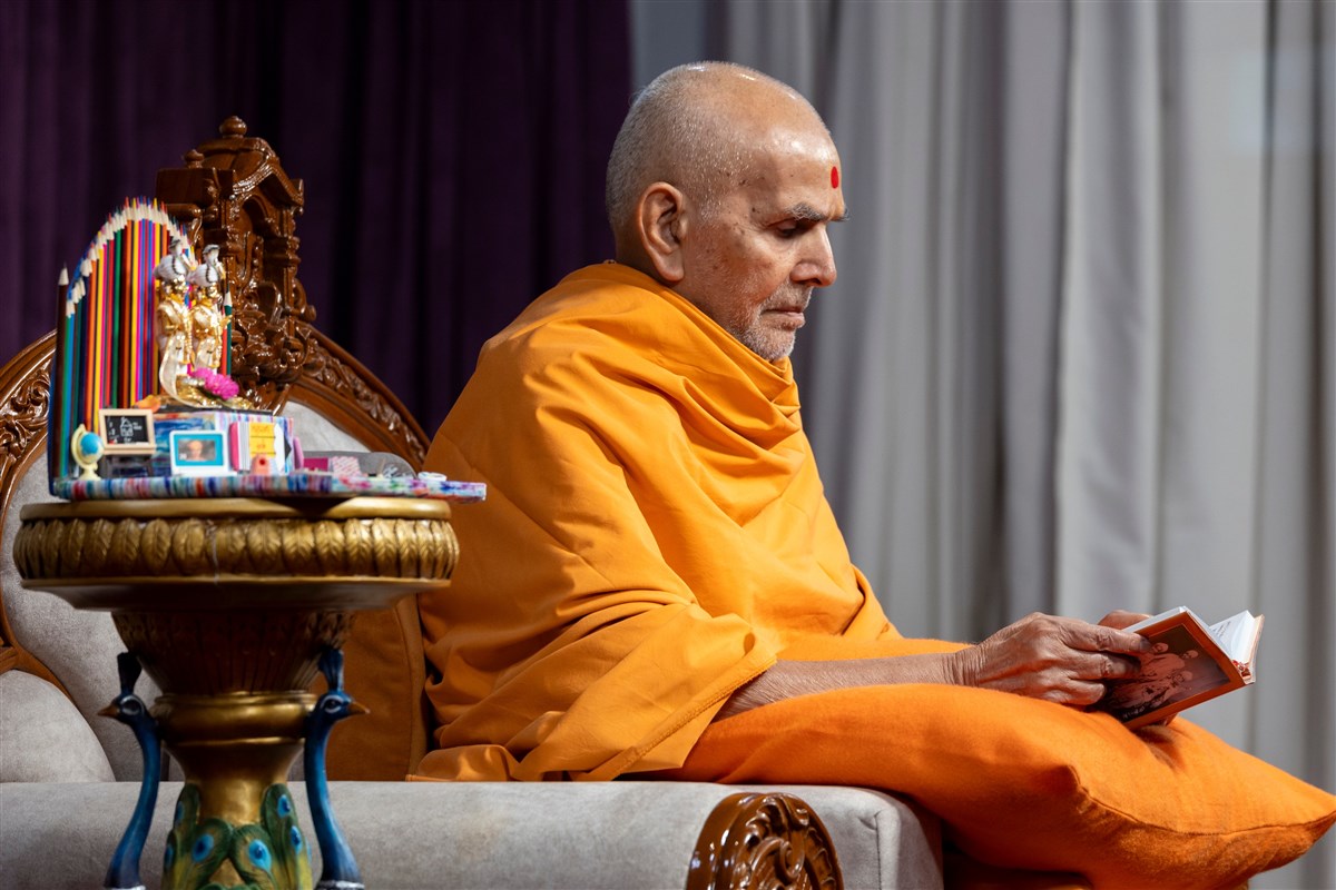 Swamishri, with eyes closed, chants the Swaminarayan mantra