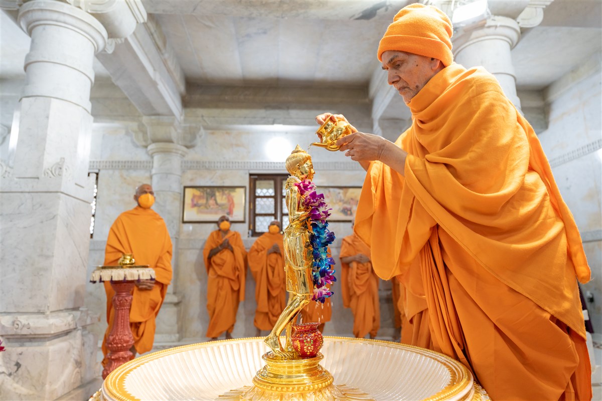 Swamishri performs the abhishek of Shri Nilkanth Varni