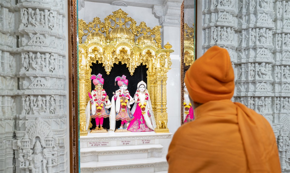 Swamishri doing darshan of Shri Harikrishna Maharaj and Shri Radha-Krishna Bhagwan