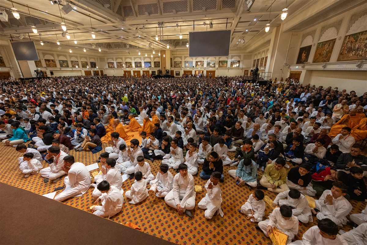 Devotees listen attentively to Swamishri's blessings in the morning assembly