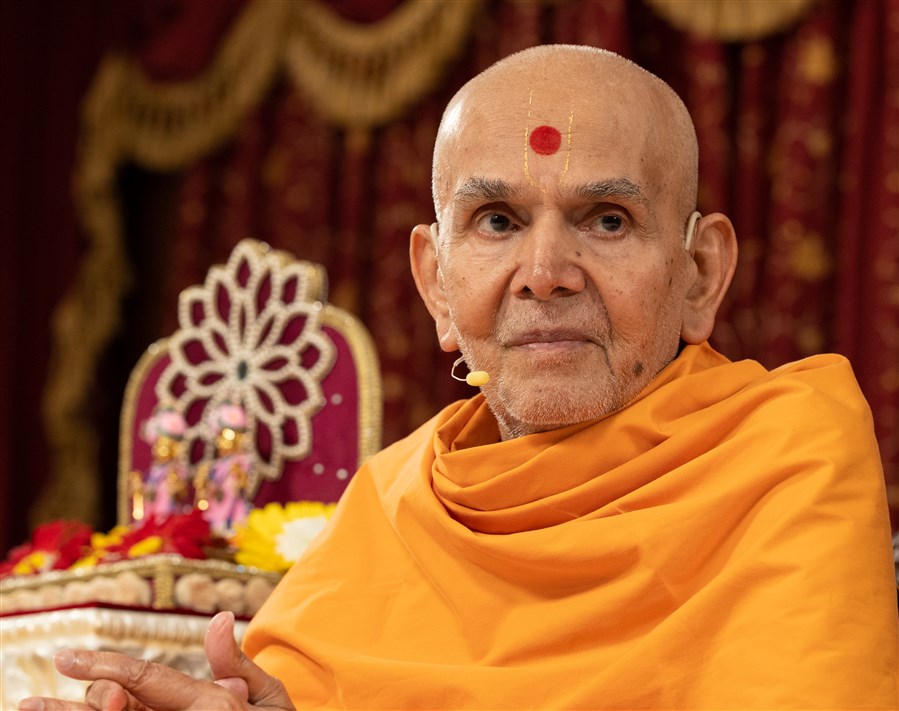 Param Pujya Mahant Swami Maharaj arrives in the upper sanctum for darshan