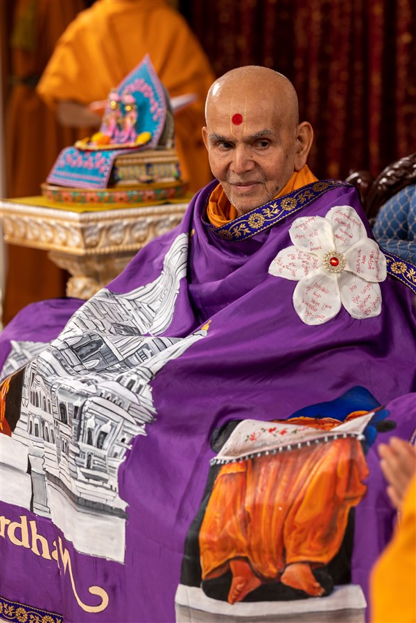 Munirajdas Swami and Bhaktiswarupdas Swami present to Swamishri a decorative shawl from North America