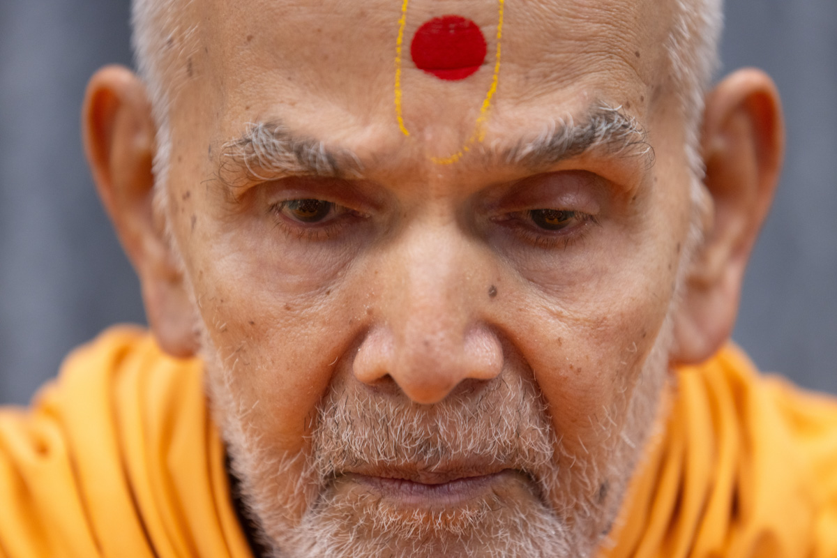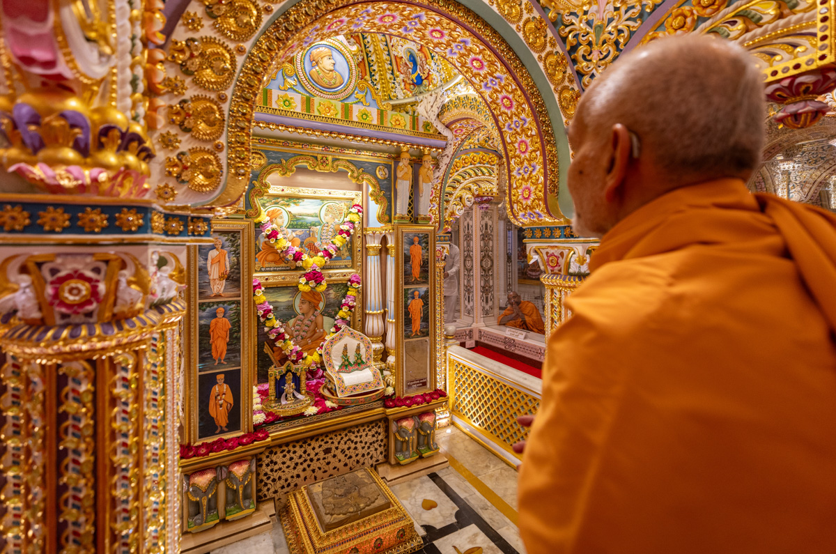 Param Pujya Mahant Swami Maharaj arrives for darshan in the Akshar Deri