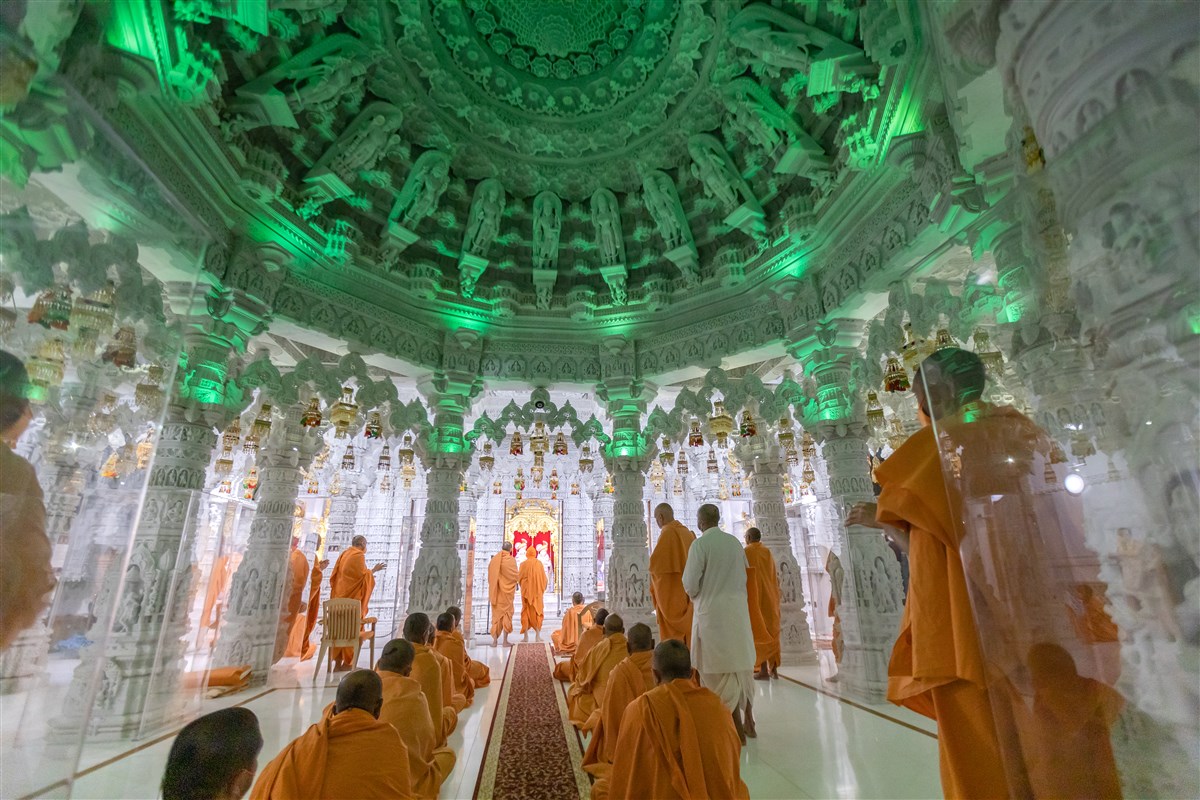 Param Pujya Mahant Swami Maharaj performs the morning arti